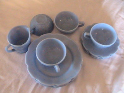 Title (ebay affiliate link): Blue milk glass saucers cups creamer dessert plates cherry pattern fenton?