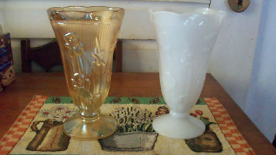 Title (ebay affiliate link): TWO VINTAGE JEANNETTE GLASS IRIS & HERRINGBONE 9" VASES 1 CARNIVAL 1 MILK WHITE