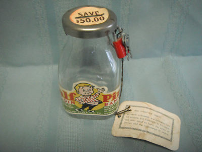 VINTAGE HALF PINT MILK, DAIRY BOTTLE GLASS BANK, LOCK, KEYS, METAL CAP, TAG NICE