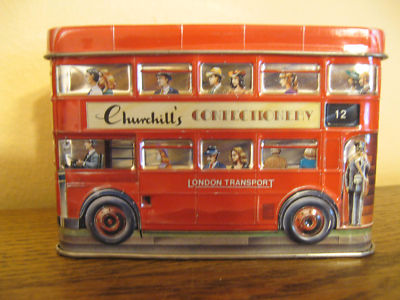 CHURCHILL'S CONFECTIONERY DOUBLE DECKER BUS TIN/BANK-LONDON TRANSPORT-3.25" X 4.