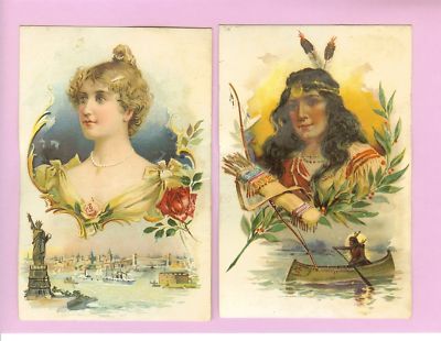 2 victorian trade cards, florida water, Indian, statue of liberty, women