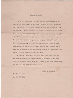 Title (ebay affiliate link): Warren G. Harding Executive Order White house Appointed Postmaster 1922 Letters