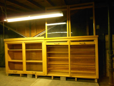 Cabinets LARGE with sliding glass doors oak fronts counter-weights lift doors