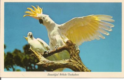 Title (ebay affiliate link): VINTAGE PC,BEAUTIFUL WHITE COCKATOOS AT PARROT JUNGLE, MIAMI.FLORIDA