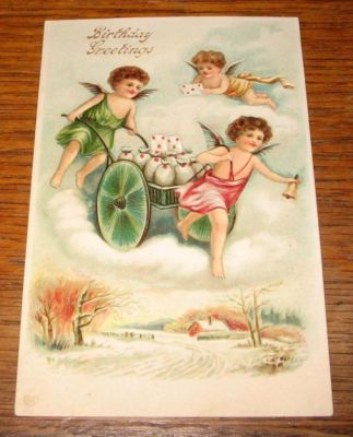 Title (ebay affiliate link): Angels Pulling Cart Birthday Greetings Vintage Postcard