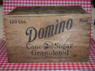 Title (ebay affiliate link): ANTIQUE DOMINO SUGAR WOOD BOX ADVERTISING CRATE 120 LBS GRANULATED