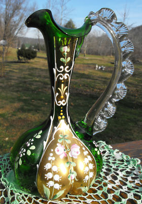 Title (ebay affiliate link): Hand Blown Hand Painted Ruffled Handle Pitcher Vase Art Glass Emerald Green