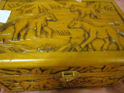 BEAUTIFUL HONEY OAK STAIN WOODEN BOX CARVED WITH HORSES 12"W X 8"D X 6"