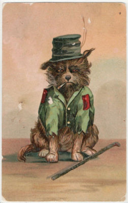 Title (ebay affiliate link): 1908 Color Comic Postcard Dog With Tattered Coat Hat Cigarette