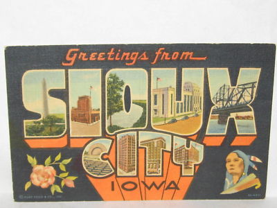 Title (ebay affiliate link): 1947 LINEN LARGE LETTER POSTCARD GREETINGS FROM SIOUX CITY IA W/ SITES