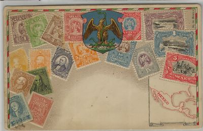 Title (ebay affiliate link): pre 1915 postcard showing 18 early Mexico Stamps embossed into the design