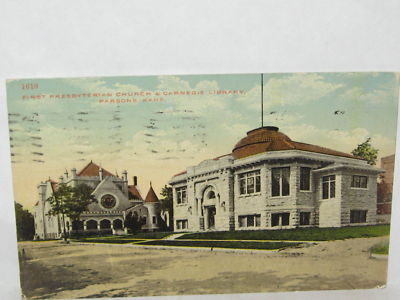 Title (ebay affiliate link): 1914 POSTCARD FIRST PRESBYTERIAN CHURCH & CARNEGIE LIBRARY PARSONS KS