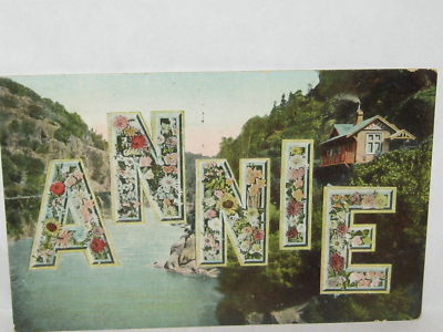 Title (ebay affiliate link): 1908 LARGE LETTER FLORAL POSTCARD " ANNIE " W/ CABIN