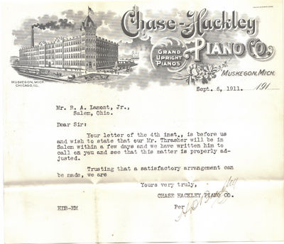 Title (ebay affiliate link): Illustrated Advertising Letterhead, Chase - Hackley Piano Co.,Muskegon,Mich.