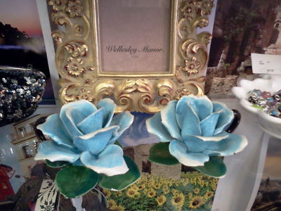 Beautiful pair of Blue Rose Capodimonte Candle Holders Made in Italy crown stamp