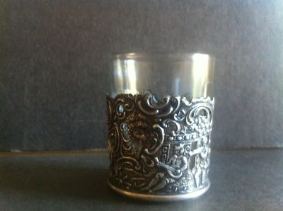 Title (ebay affiliate link): Unique Antique etched oversized shot GLASS with ornate sterling silver sleeve