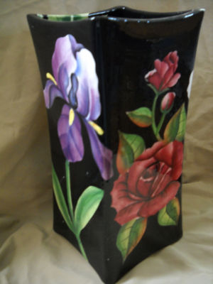 VASE 12"X 5.5" PACIFIC RIM HAND PAINTED IRIS,LILLIES,ROSES,ON BLACK GLAZE 4 SIDE
