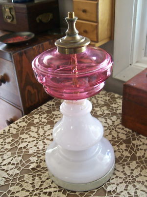 Title (ebay affiliate link): ANTIQUE CONVERTED PINK & MILK GLASS KEROSESNE /OIL LAMP BASE ~ BRASS FITTING