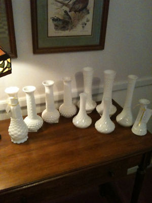 Title (ebay affiliate link): Lot of 10 Milk Glass Bud Vases Various Patterns Various Sizes