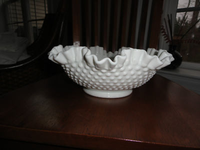Title (ebay affiliate link): LARGE WHITE MILK GLASS FENTON HOBNAIL RUFFLE EDGE BOWL FLUTED CRIMPED BOWL EST9