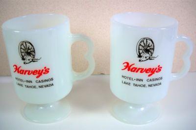 Title (ebay affiliate link): VINTAGE Harveys Casino Lake Tahoe Set of 2 Milk Glass Pedestal Mugs