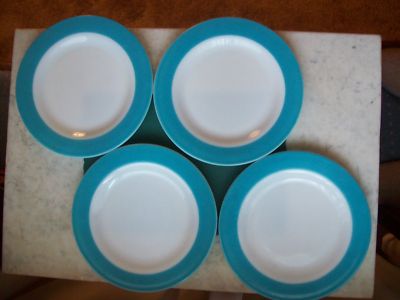 Title (ebay affiliate link): 4 vintage Pyrex Big Turquoise Edge Plates 10 " 1960s Estate milk glass USA