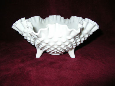 Vintage Fenton Hobnail Milk Glass Footed Bowl Double Crimped Ruffled Edge