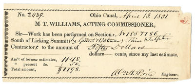 Title (ebay affiliate link): Ohio Canal Check Certificate M.T. Williams Gilbert Price Licking Summit Lot 1831