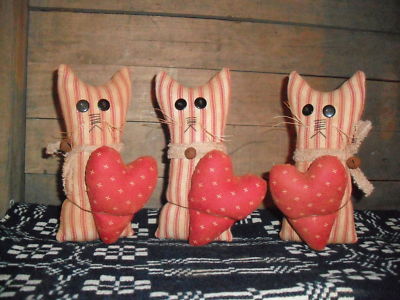 Title (ebay affiliate link): 3 PRIMITIVE VALENTINE RED TICKING CAT DOLLS WITH HEARTS SHELF SITTERS