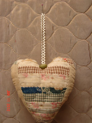 Title (ebay affiliate link): Primitive Handmade Valentine heart ornie~string pattern of creams, greens, rose