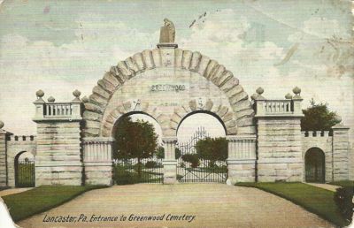 Title (ebay affiliate link): ANTIQUE 1908 POSTCARD - ENTRANCE TO GREENWOOD CEMETERY, LANCASTER, PA (DAMAGED)