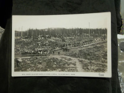 Title (ebay affiliate link): EARLY,MANY GLACIER SADDLE HORSE CORRAL,GLACIER NATIONAL PARK,MONTANA,REAL PHOTO