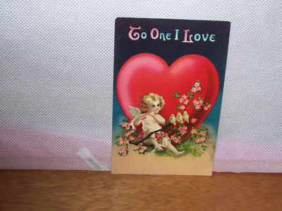 Title (ebay affiliate link): 1912 "CUPID PLAYING A FLUTE TO THREE BIRDS WHILE RESTING BY A VALENTINE HEART!!"