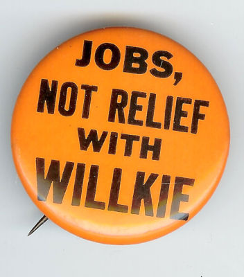 Title (ebay affiliate link): JOBS, NOT RELIEF WITH WILLKIE Anti-Roosevelt Slogan Pin!