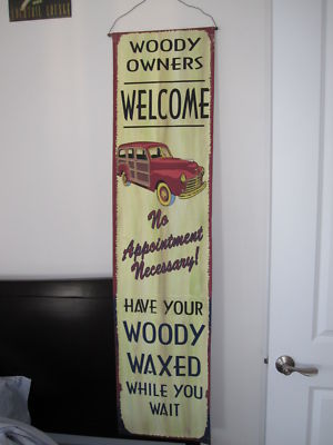 Title (ebay affiliate link): Vintage Woody cloth sign "Have your woody waxed while you wait" 5 feet long!