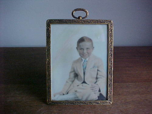 VINTAGE MILK GLASS PHOTO BOY FANCY BRASS FRAME