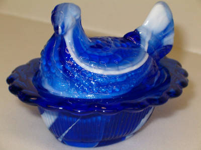 COBALT MILK SLAG GLASS HEN CHICKEN ON NEST BASKET DISH