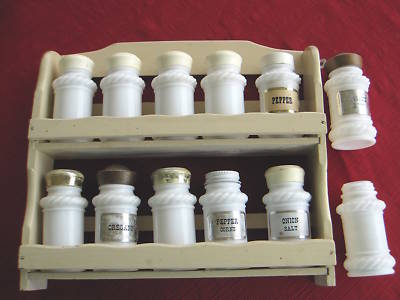 VINTAGE MILK GLASS SPICE JARS BOTTLES AND WOODEN RACK