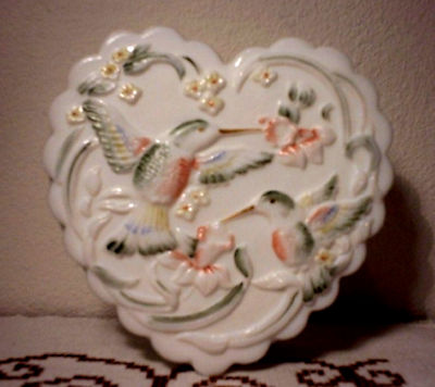 Fenton Milk Glass Heart Shaped Box Hummingbird Design