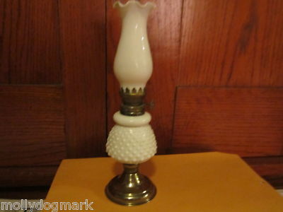 Title (ebay affiliate link): Vintage Small Oil Lamp 10.25" High Milk Glass Hobnail w/Brass Base