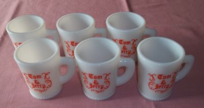 Title (ebay affiliate link): 6 Vintage McKee Tom & Jerry White Milk Glass Mugs w/ Beading and Red Lettering