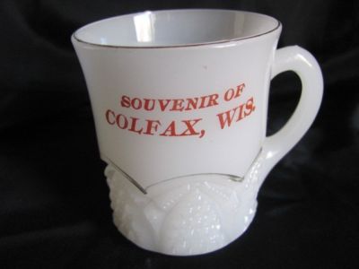 EAPG 1897 DUNCAN & MILLER BUTTON ARCHES MILK GLASS SOUVENIR MUG, COLFAX, WIS