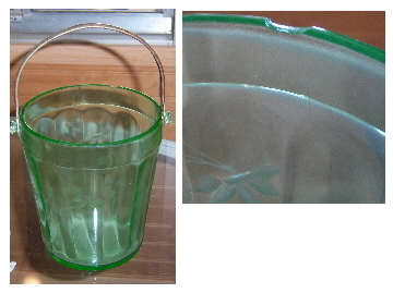 Title (ebay affiliate link): Vintage green etched depression glass ice bucket silver tone handle chip on rim