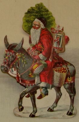 VINTAGE 7" TALL PAPER DIE-CUT SANTA ON DONKEY WITH TREE & TOYS