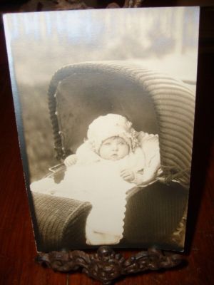ANTIQUE PHOTO OF A SWEET BABY FANCY BONNET IN A BIG WICKER BUGGY