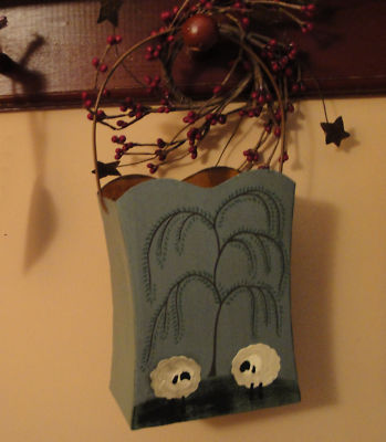 Primitive Tin Flower / Candle/ Holder w Bail Handle Blue w Sheep & Willow Tree