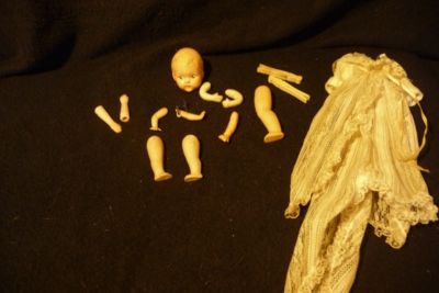 SMALL ANTIQUE BISQUE DOLL PARTS VINTAGE DRESS & HARD PLASTIC VOGUE DOLL HEAD