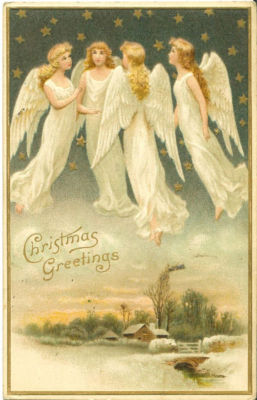 Title (ebay affiliate link): Four Blond Angels over village / Vintage Christmas / Dugdale Mn 1910