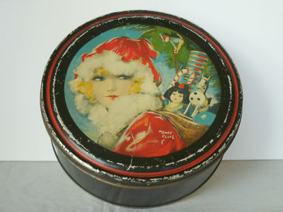 Title (ebay affiliate link): VINTAGE, BISCUIT TIN; CHRISTMAS PRETTY LADY IN SANTA HAT; SIGNED, HENRY CLIVE