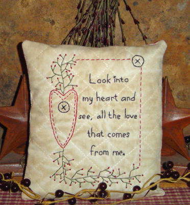 Title (ebay affiliate link): ~LOOK INTO MY HEART AND SEE~ ~ Primitive Stitchery Sampler Pillow